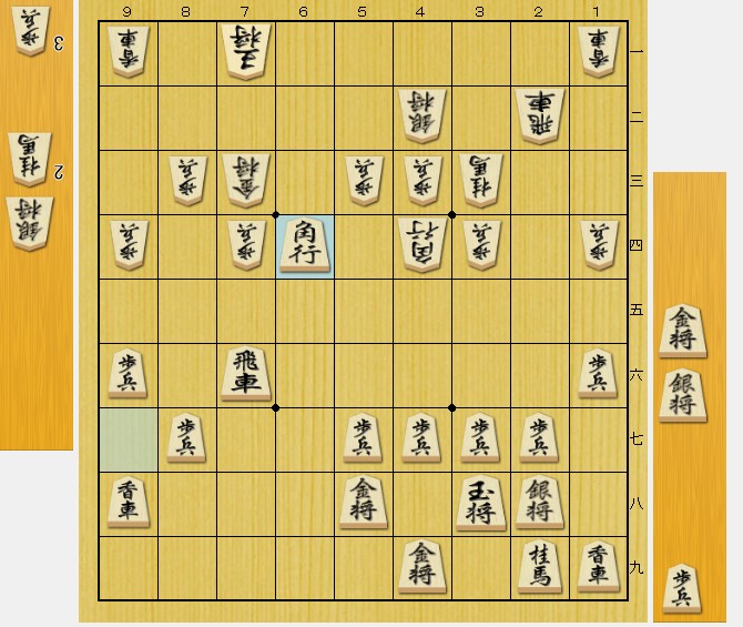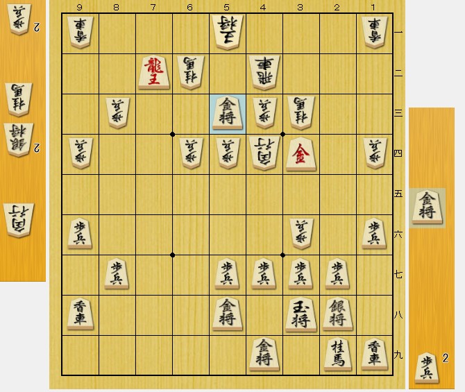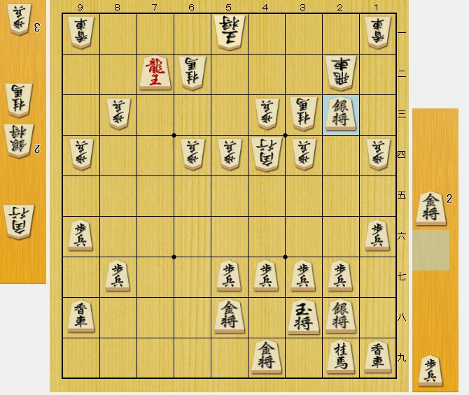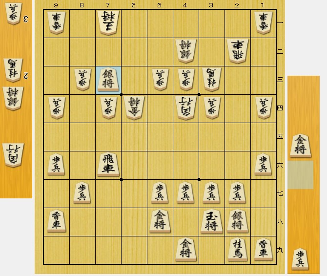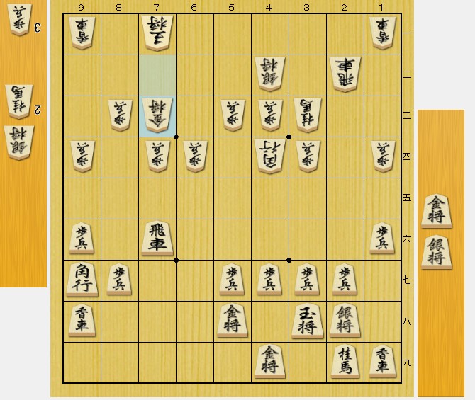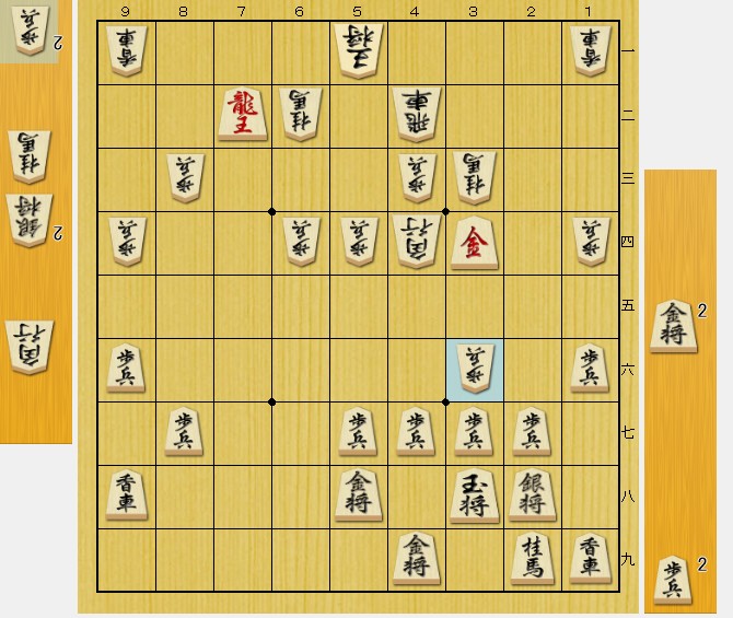 相手(後手私)の飛車がここにいなければ、 ▲32金 から、「挟み撃ちの必至」なのですが…。