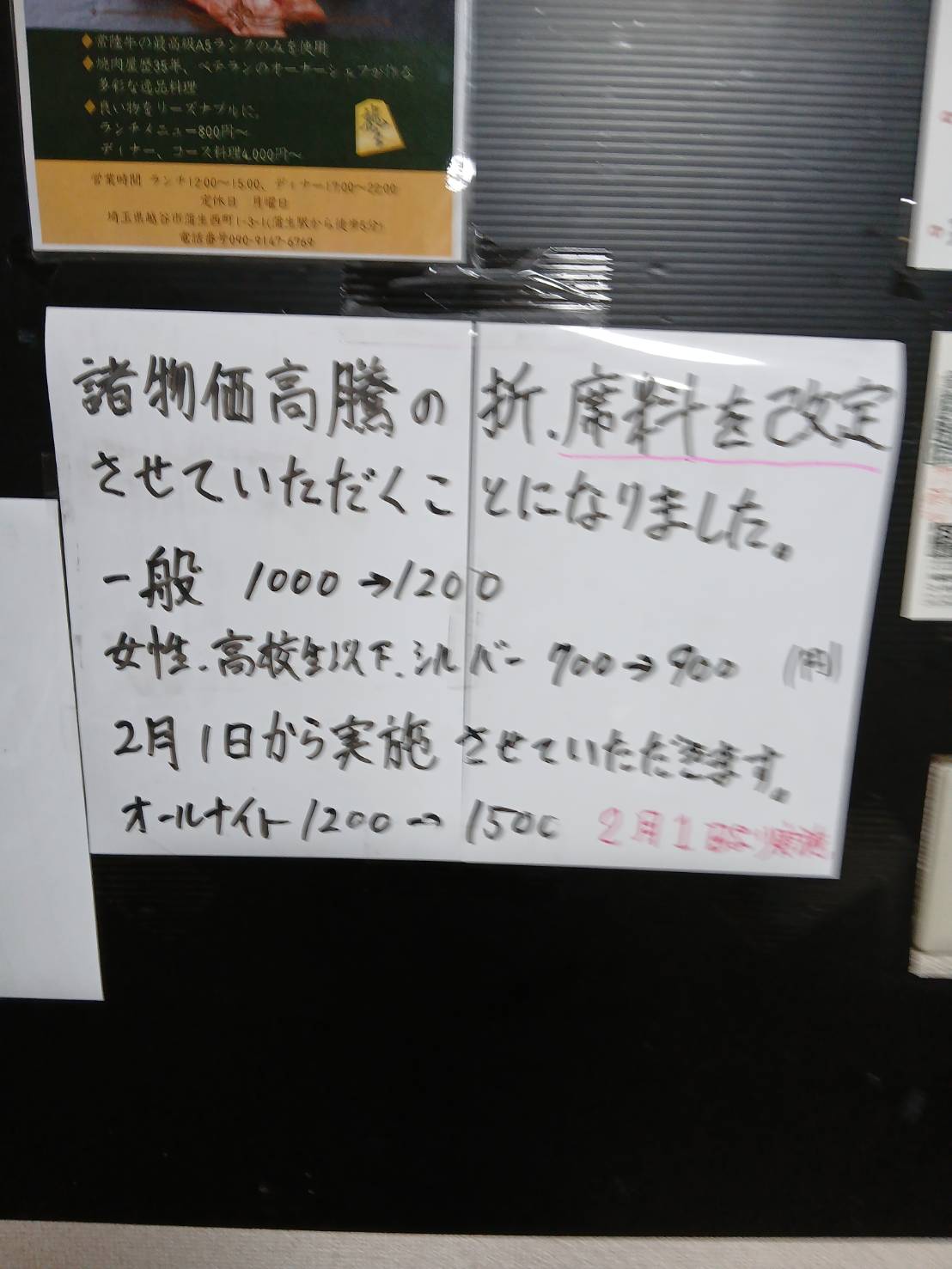 このたび、2月1日より、200円ほど席料を値上げさせていただくことになりました。