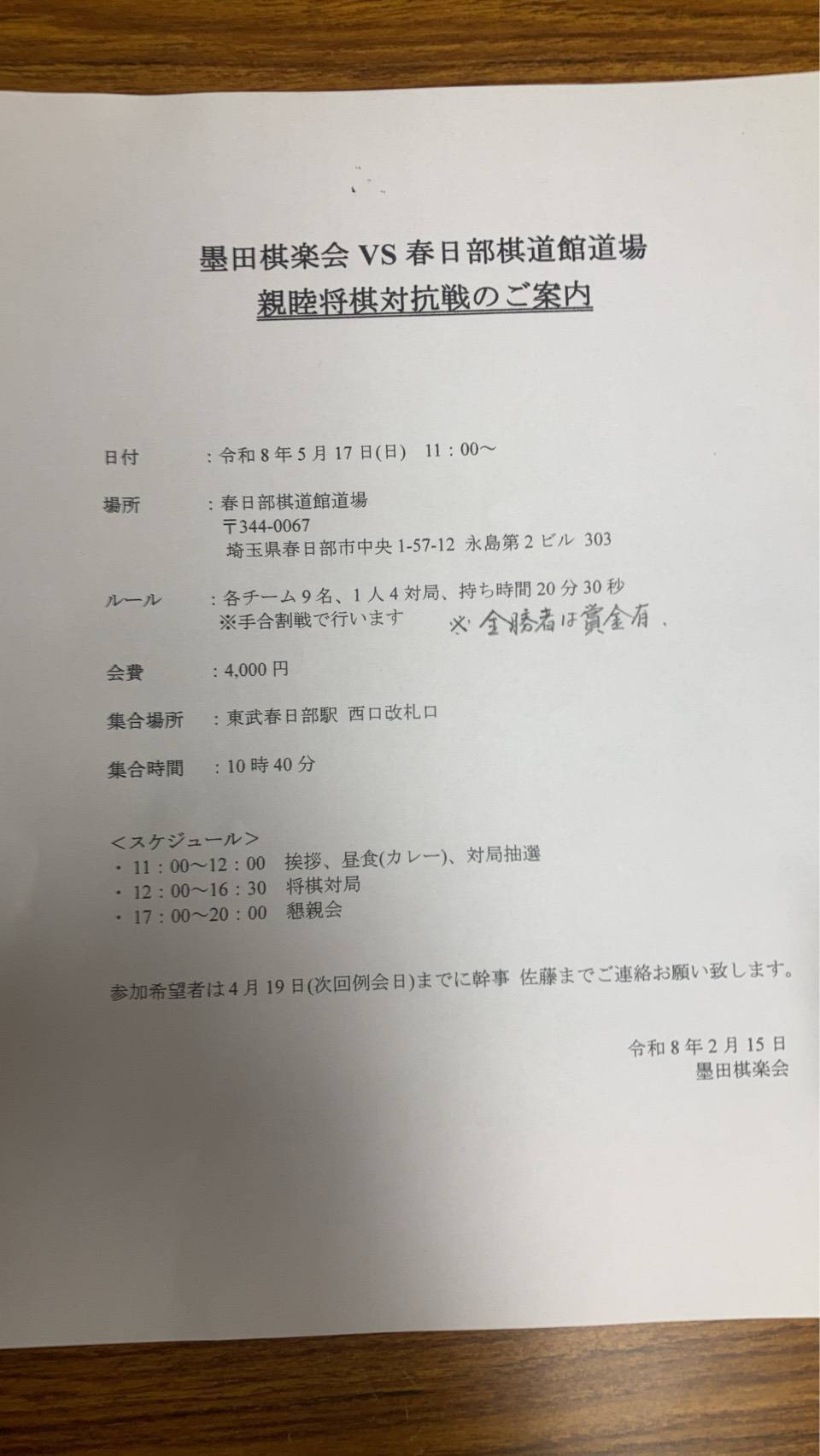 5月17日(日)、場所は春日部棋道舘で、棋楽会の方々と交流対抗将棋大会をします。