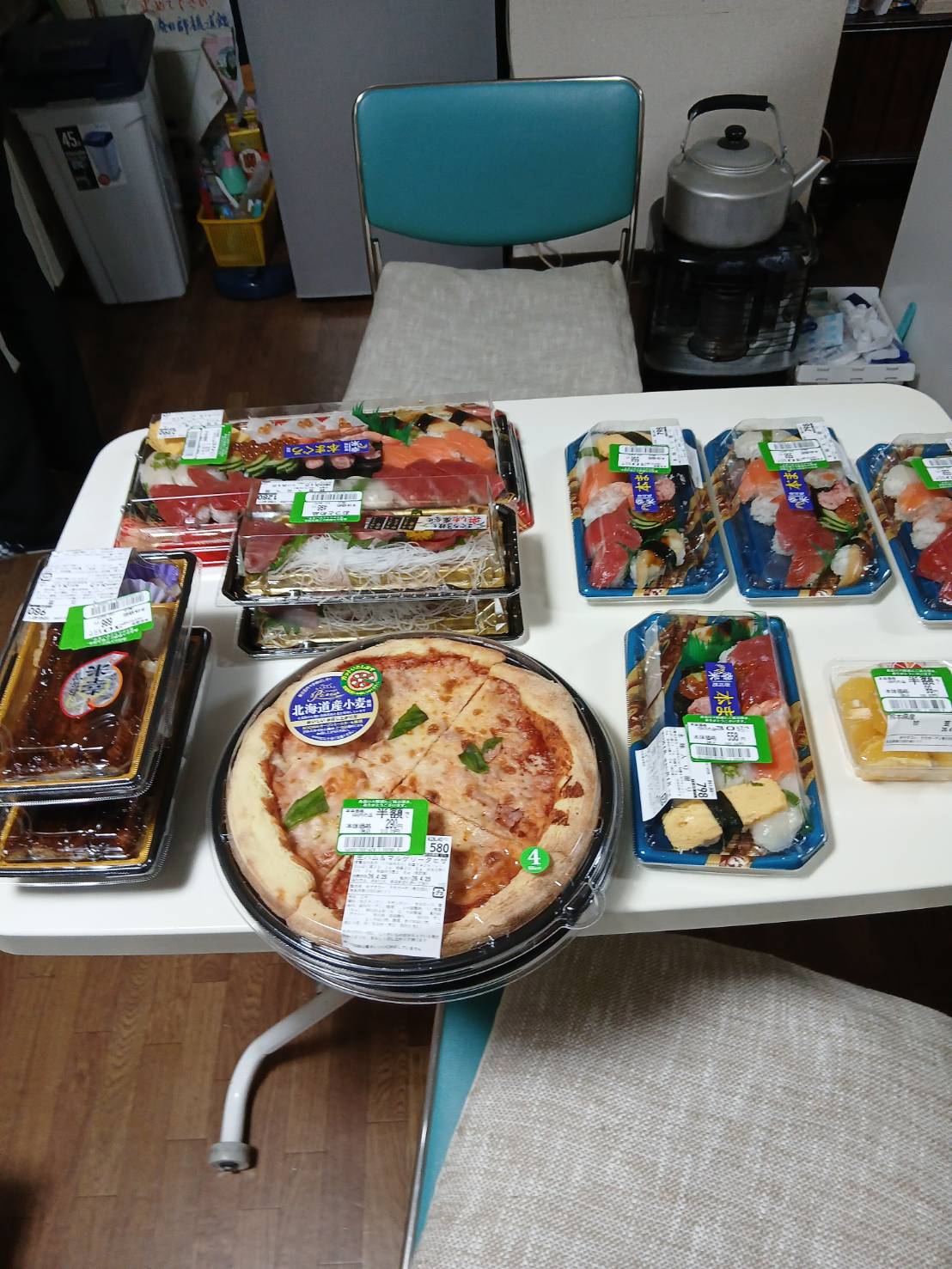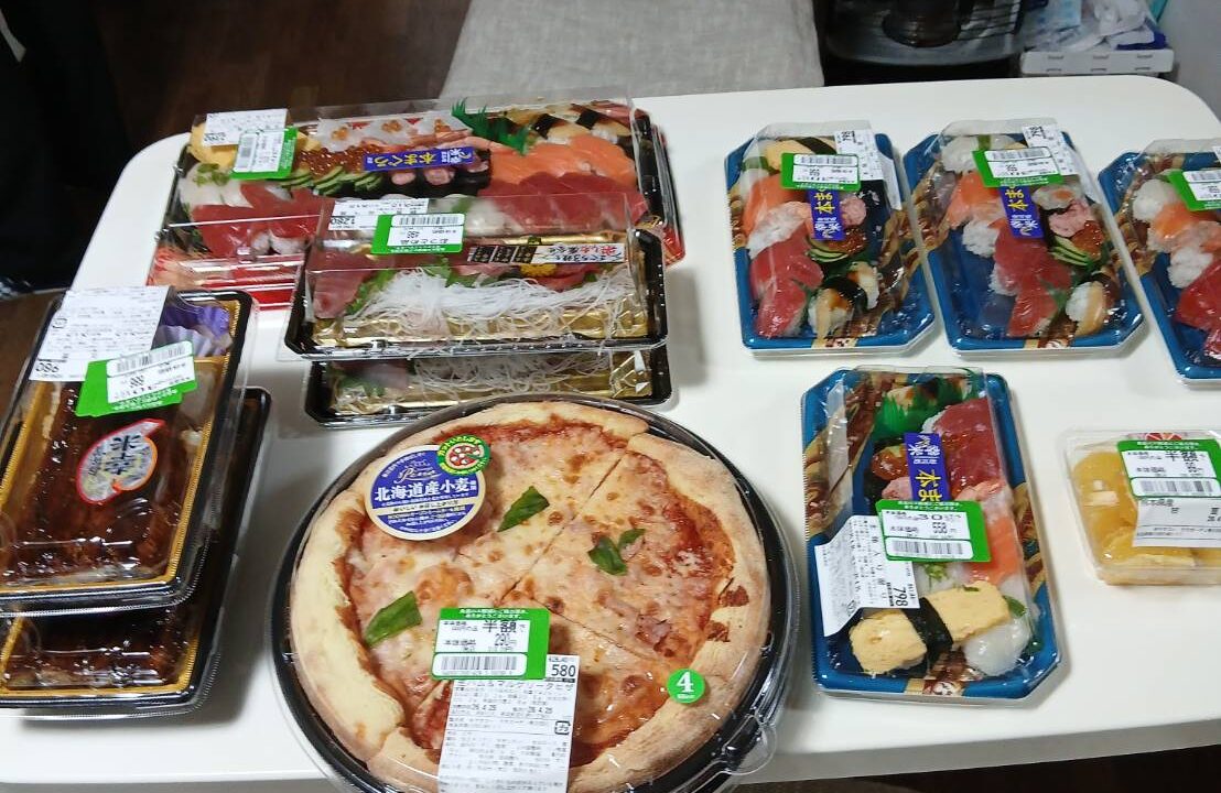 寿司、ピザ、うなぎ、からあげ、豚の角煮、刺身、甘夏みかん と全部で一万円ほど。